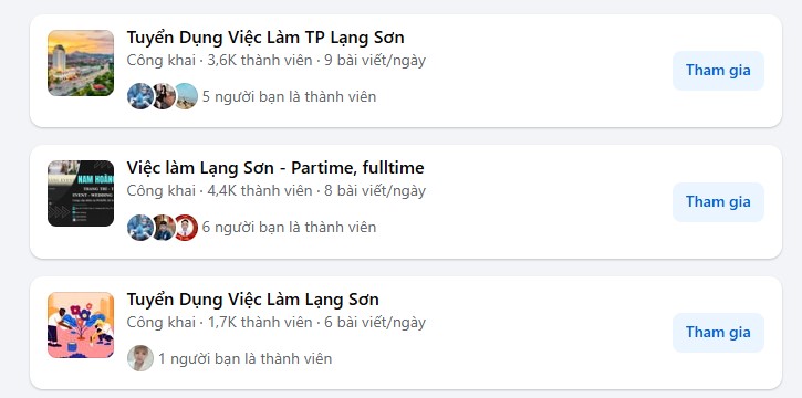 Bạn có thể tìm việc làm tại các hội nhóm facebook ví dụ như truyển dụng việc làm lạng sơn, việc làm lạng sơn, việc làm lạng sơn 24h …